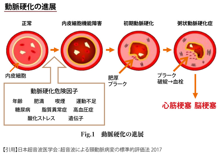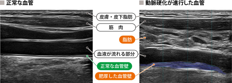 脳を栄養する頸部の血管を超音波で観察し、病変を見つける検査です。動脈硬化が進行するとこの血管に狭窄(内腔が狭くなること)が起こり、意識障害、片麻痺、頭痛、めまい、血管痛などを引き起こすとされています。 症状が出るまで進行していた場合、狭窄は非常に強く侵襲的な治療が必要な状態といえます。そうなる前に動脈硬化の進行を見つけたいのですが、血管壁の厚さは1.0ミリ未満~2.0ミリ程度で、侵襲性がなくこのレベルの分解能をもつ検査機器はエコーだけです。エコーで動脈硬化を検査し、症状が出る前に危険因子を排除(禁煙や生活習慣の見直し、適度な運動など)することで、病気にならない身体づくりを応援します。