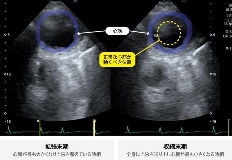 心臓サイズの計測をしたり、心臓がどの程度動いているか、弁の逆流や通過障害が起こっていないかを調べる検査です。心筋梗塞では心臓の動きが特徴的に悪くなります。心筋梗塞を疑う症状が出たときには、すぐに心臓の動きを確認することは重要です。心臓には四つの部屋があり、逆流を防止するために四つの弁があります。この弁が閉まらなかったり、開きにくくなると息切れや失神などが起こることがあります。