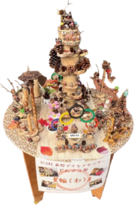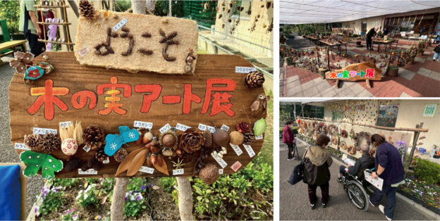本展には、どんぐり部で活動されている利用者様が制作した作品も出展され、どんぐりや松ぼっくり、木の枝など、身近な自然素材を使った個性あふれる作品が並びました。