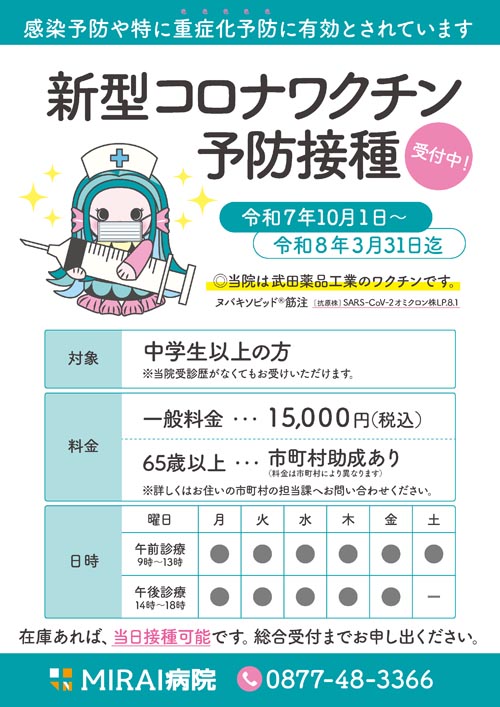新型コロナワクチンの接種を実施しております。在庫がある場合は、当日の接種も可能です。総合受付までお気軽にお申し出ください。