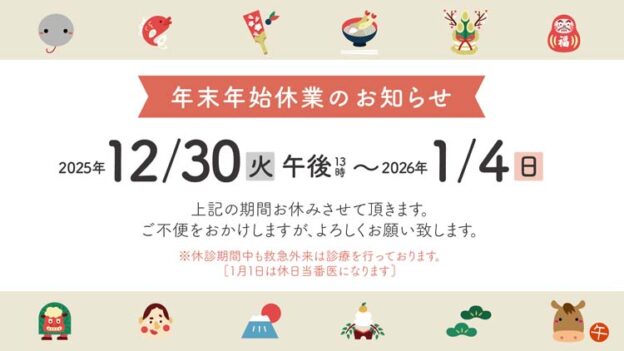 年末年始休業のお知らせ 2025年12月01日 年末年始休業のお知らせ 2025年12月30日(火)午後より2026年1月4日(日)までの期間、お休みをいただきます。※休診期間中も救急外来は診療を行なっております。尚、1月1日は休日当番医です。